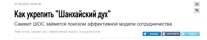 文章说,上海合作组织峰会即将在中国天津开启,此次峰会是上合组织2001年成立以来规模最大的一届峰会,包括俄罗斯总统普京在内的20多位外国领导人和10位国际组织负责人将出席会议。